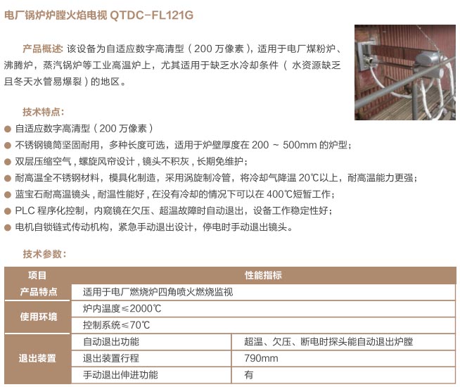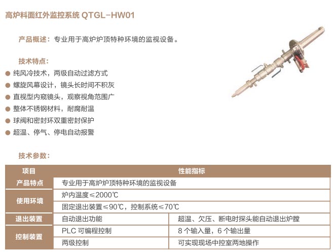 爐窯高溫監(jiān)測監(jiān)控系統(tǒng)是專為工業(yè)高溫爐窯監(jiān)測監(jiān)控的設計的智慧管理平臺,是針對爐壁開孔和爐窯視像有嚴格要求的高溫爐窯而研制的高溫工業(yè)電視。利用特種高溫孔式光學鏡頭,鏡頭設計采用中繼物鏡,兩次成像系統(tǒng),使像面在遠離觀察孔的CCD靶面上形成,最大限度的減少進入攝像機的熱輻射,致力為冶金、電力、建材、礦山、化工等行業(yè)服務。我公司研發(fā)主導產品已擁有第三代SG內窺式高溫工業(yè)電視系列、爐壁式高溫工業(yè)電視系列、內窺式拐角高溫工業(yè)電視系列、鍋爐汽包水位電視系統(tǒng)等成套設備,以及各種風冷防護罩,水冷防護罩,渦旋制冷防護罩等工業(yè)監(jiān)控設備配套產品。產品廣泛應用于鋼鐵廠加熱爐、退火爐,電廠鍋爐爐膛火焰、水泥廠回轉窯窯頭看火、篦冷機看料、玻璃廠玻璃熔窯等特殊高溫環(huán)境。幫助用戶進行工業(yè)爐實時電視監(jiān)測及控制,解決設備的運行故障等,對用戶改善產品質量、降低成本、安全生產有著獨特的成效。受到了用戶的一致好評。