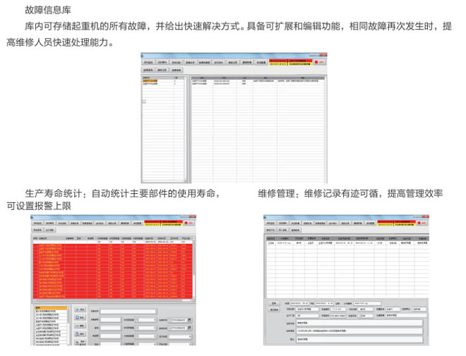 AGF系列起重機(jī)械安全監(jiān)控管理系統(tǒng)是我公司自主開發(fā)研制的產(chǎn)品,按照國質(zhì)檢特聯(lián)【2011】137號(hào)文件的要求,嚴(yán)格執(zhí)行國標(biāo):GB/T 28264-2017生產(chǎn),廣泛用于各行業(yè)大型起重設(shè)備機(jī)械、提升機(jī)、架橋機(jī)、港機(jī)、工程機(jī)械等,系統(tǒng)是為各種起重機(jī)的運(yùn)行監(jiān)視、診斷分析、設(shè)備預(yù)警與檢修維護(hù)而搭建的信息系統(tǒng)管理平臺(tái)。系統(tǒng)實(shí)時(shí)記錄起重機(jī)的運(yùn)行參數(shù)、操作記錄,當(dāng)滿足故障條件和設(shè)置預(yù)警值時(shí),系統(tǒng)及時(shí)提醒和記錄各種事件信息,為起重機(jī)的操作人員和維護(hù)人員提供實(shí)時(shí)的、詳盡的歷史數(shù)據(jù)和分析報(bào)表。起重機(jī)安全監(jiān)控管理系統(tǒng)具有可靠穩(wěn)定性、靈活交互性、便捷易用性,是集實(shí)時(shí)監(jiān)控﹑故障報(bào)警﹑數(shù)據(jù)登錄﹑設(shè)備維護(hù)﹑運(yùn)行統(tǒng)計(jì)于一體的現(xiàn)代起重機(jī)綜合信息管理平臺(tái)。