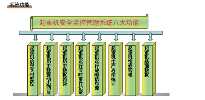 •- 通過起重機(jī)安全監(jiān)控管理系統(tǒng),運(yùn)行管理人員可以通過系統(tǒng)對(duì)起重機(jī)運(yùn)行中出現(xiàn)的故障進(jìn)行 查詢和處理;對(duì)設(shè)備及元器件進(jìn)行系統(tǒng)管理;指導(dǎo)定期對(duì)系統(tǒng)進(jìn)行維修和調(diào)試。系統(tǒng)具備以 下功能:實(shí)時(shí)狀態(tài)顯示、實(shí)時(shí)報(bào)警顯示、歷史記錄查詢、部件壽命監(jiān)測、事故診斷分析、數(shù) 據(jù)統(tǒng)計(jì)及權(quán)限設(shè)定管理等。