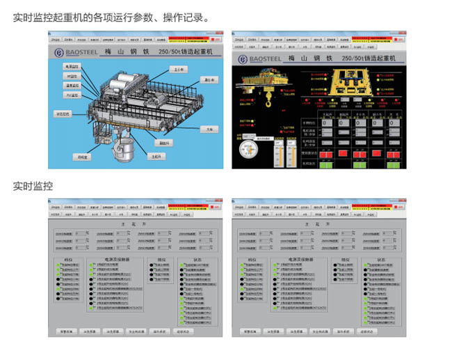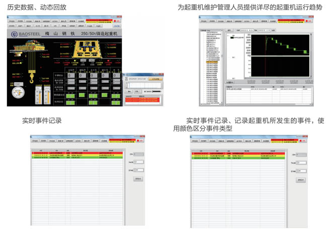 •-1、起重機(jī)狀態(tài)實(shí)時(shí)監(jiān)測:對(duì)事故易發(fā)設(shè)備和重點(diǎn)關(guān)鍵設(shè)備的運(yùn)行情況進(jìn)行實(shí)時(shí)監(jiān)測,同時(shí) 對(duì)采集的數(shù)據(jù)進(jìn)行分析整理,并把現(xiàn)場的實(shí)際數(shù)據(jù)與相關(guān)的設(shè)備運(yùn)行指標(biāo)進(jìn)行對(duì)比,超過偏 差限制時(shí)產(chǎn)生報(bào)警信息并存儲(chǔ)報(bào)警記錄。共享相關(guān)數(shù)據(jù),為及時(shí)發(fā)現(xiàn)和消除設(shè)備故障隱患提 供必要的數(shù)據(jù)支持。